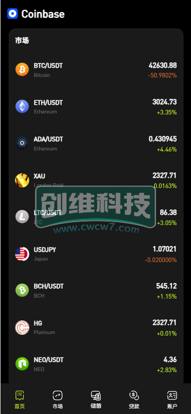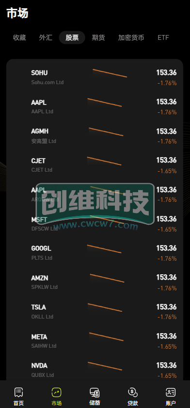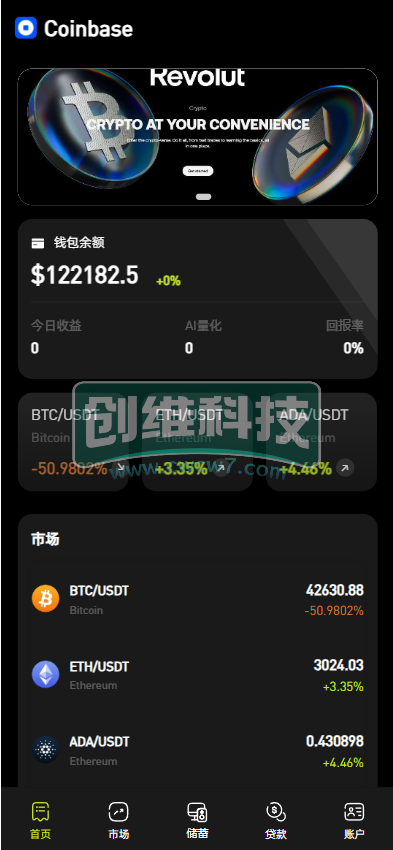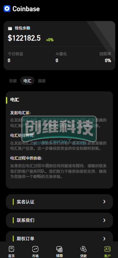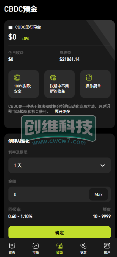 系统底部设有 “首页”“市场”“储蓄”“账户” 等导航栏,方便用户在不同功能板块间切换,如 “市场” 板块可查看各类金融产品行情,“储蓄” 板块涉及 AI 量化和 CBDC 预金,“账户” 板块管理钱包和资金操作。