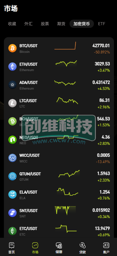 加密货币:支持(BTC)、(ETH)、ADA、LTC)等多种主流加密货币交易,可查看实时价格(如 BTC/USDT 价格波动)、涨跌幅度(绿色表示上涨、橙色表示下跌)及 K 线走势(如 BTC 的分时 K 线图,包含开盘、收盘价格,还可切换 1 分钟、5 分钟等不同时间周期)。