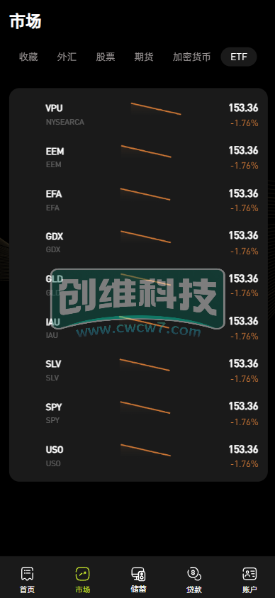 ETF:包含 VPU、EEM、EFA、GDX 等 ETF 产品,同样展示价格和涨跌情况(如 VPU 上涨 0.54%)。